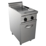 AISI 304 18/10 nerezová ocel 13 l, tloušťka 1,5 mm, lisovaná v jednom kuse. Horní stůl je lisován a vybaven velkou zaoblenou miskou, aby se vytvořila široká oblast pro expanzi oleje, aby nedošlo k přetékání oleje během vaření a manipulace s košem. Kohout vypouštějící olej je v chromátové mosazi. Olej se vypouští do ocelové misky vybavené filtrem Aisi 304 z nerezové oceli. Zahřívání pomocí vysoce výkonných nerezových plášťových odporů, upevněných pomocí speciálního zařízení, které umožňuje jejich otáčení pro snadné čištění nádrže. Teplota oleje na vaření je řízena vysoce přesným elektrickým termostatem, který ovládá elektrický stykač, který dodává energii topným skupinám. Maximální pracovní teplota je nastavena na 190 ° C a bezpečnostní termostat přeruší tok plynu v případě poruchy, která by způsobila překročení teploty oleje 230 ° C. Žárovky pracovních a bezpečnostních termostatů jsou umístěny uvnitř rezistorů a pečlivě chráněny proti náhodným nárazům. Panel je dodáván se 2 světly – oranžovou (zapnuto / vypnuto) a bílou (napětí v rezistorech), což znamená, že je přítomno napětí a že topné skupiny jsou zapnuté. Ocelové dveře s magnetickým zavíráním. Nastavitelné nohy AISI 304 18/10 z nerezové oceli. Certifikováno podle norem CE.